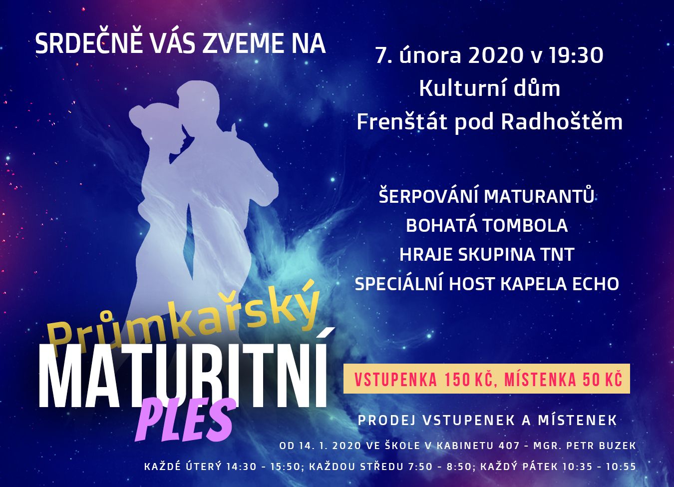Srdečně Vás zveme na "Průmkařský maturitní ples", který se koná 7. 2. 2020 v Domě kultury ve Frenštátě pod Radhoštěm.